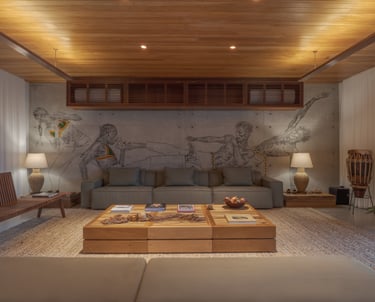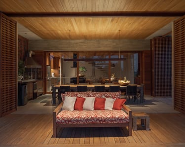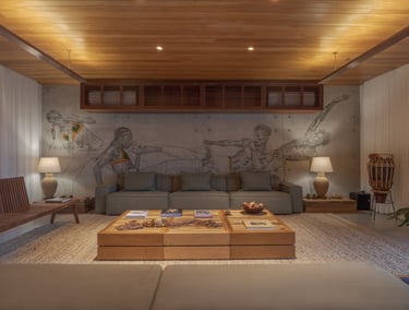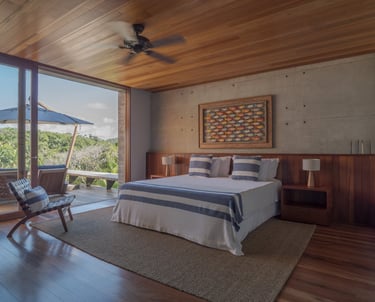 Pensada para receber até 14 pessoas, a villa se destaca por sua arquitetura elegante, resultado do encontro entre influências brasileiras e escandinavas. As linhas modernas, os materiais naturais e os elementos artesanais criam espaços harmoniosos, iluminados e profundamente conectados à natureza ao redor.