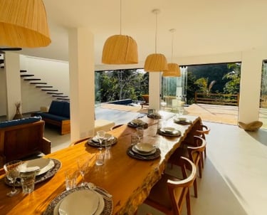 With four air-conditioned suites and well-designed living areas, Villa Dendê provides a smooth and enjoyable stay. The main living space connects the living room, dining area, and fully equipped kitchen in a harmonious open layout, perfect for gathering after a day of sun, surf, or hiking. Outside, the spacious deck, shallow-area pool, and outdoor gourmet space create an inviting environment to relax and enjoy Bahia’s warm climate.